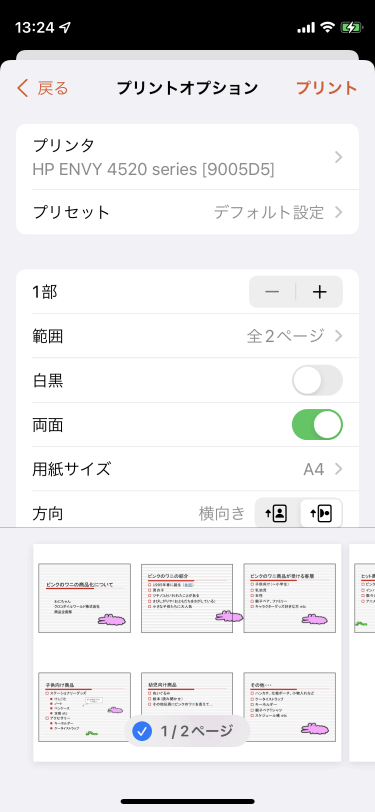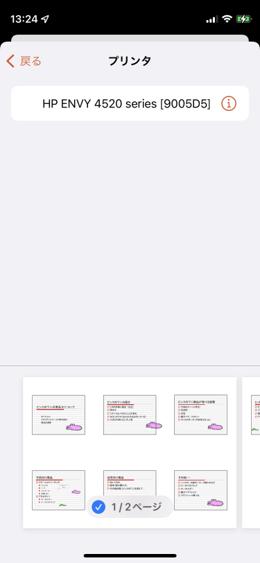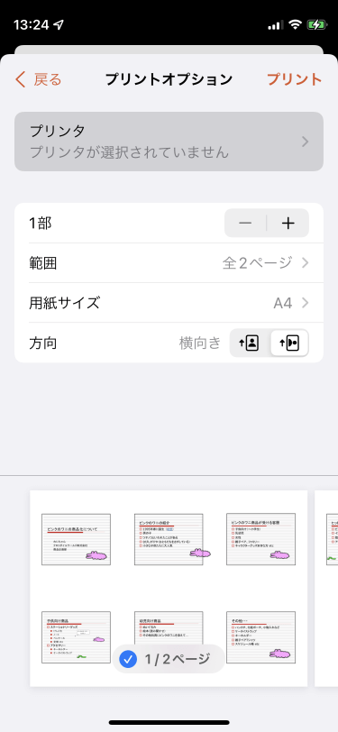 - 用紙サイズを指定して[プリント]をタップすると、印刷が開始されます。