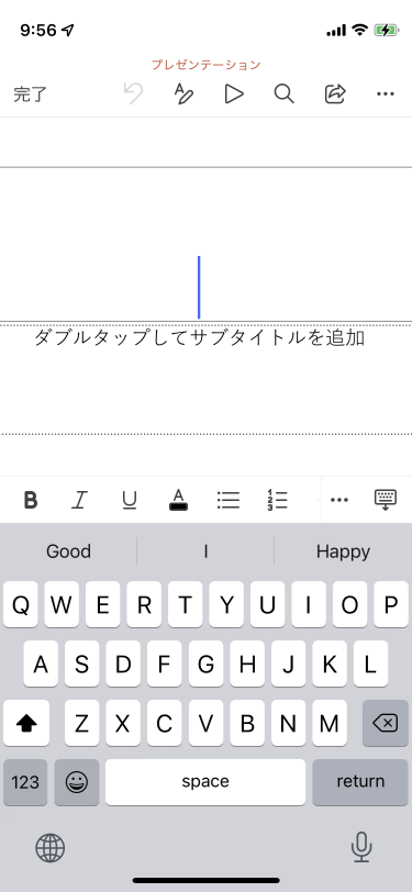 - タイトルのプレースホルダーにカーソルが表示されるので、そのままテキストを入力して、「ダブルタップしてテキストを追加」のところをダブルタップします。