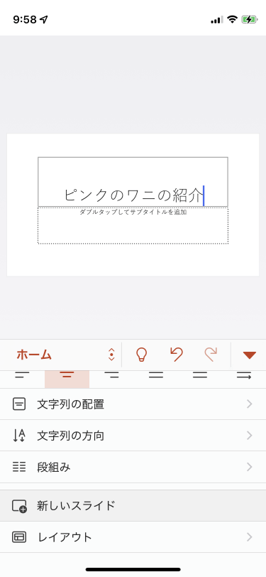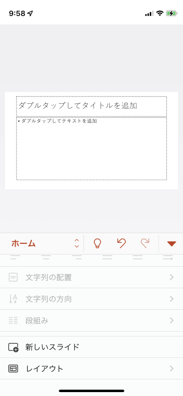 - [ホーム]メニューの[新しいスライド]をタップします。
