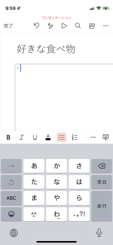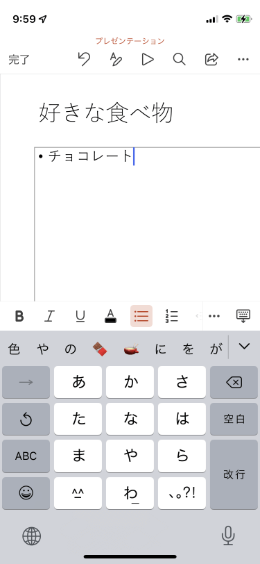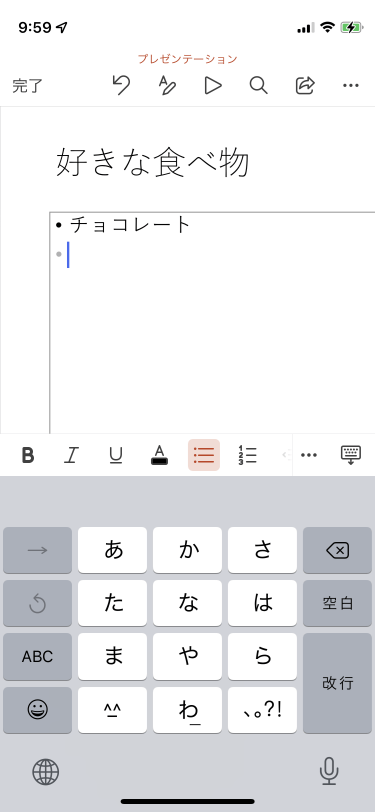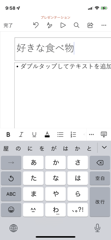PowerPoint for iPhoneでプレースホルダーに何もテキストが入力されていない場合は「ダブルタップしてタイトルを追加」「ダブルタップしてテキストを追加」と表示されます。そこにダブルタップして文字を入力していくとOKです。コンテンツのプレースホルダーにテキストを入力して改行キーを押すと、次の項目を入力できるようになります。