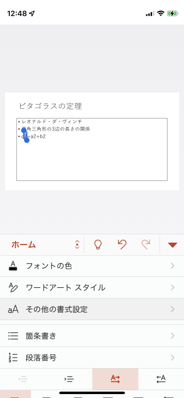 - [ホーム]メニューの[その他の書式設定]をタップします。