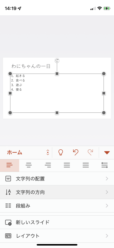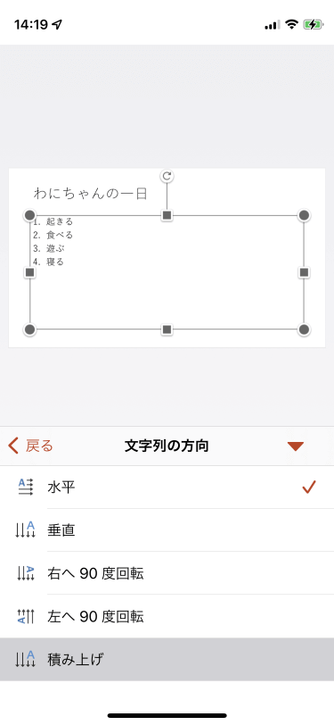 PowerPoint for iPhoneで[ホーム]メニューの[文字列の方向]をタップして、一覧から文字列の方向を選択します。[積み上げ]を選択すると縦書きになります。