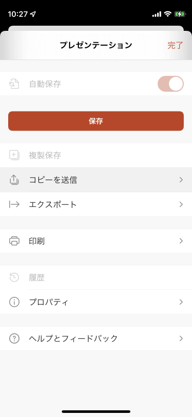 [ファイル]をタップし、[コピーを送信]を選択して、ファイル形式と送信方法を選択します。この方法では、未保存のプレゼンテーションでもOKです。