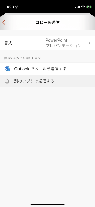 [コピーを送信]オプションで、書式(PowerPointプレゼンテーションかPDFか)、共有する方法を選びます。PowerPointプレゼンテーションをメールアプリで送信する場合、PowerPointプレゼンテーションのまま、[別のアプリで送信する]をタップします。