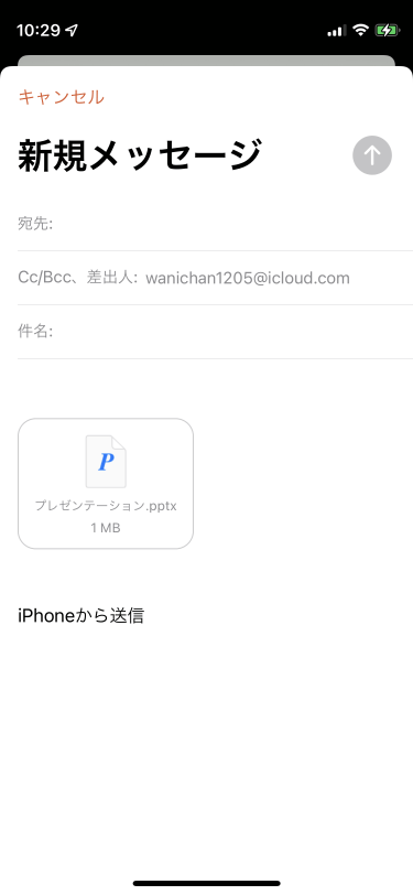 新しいメッセージに作業中のプレゼンテーションのコピーが添付されたことを確認し、宛先や件名等を編集して、右上の[送信]をタップするとOKです。