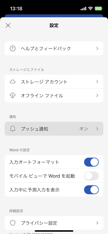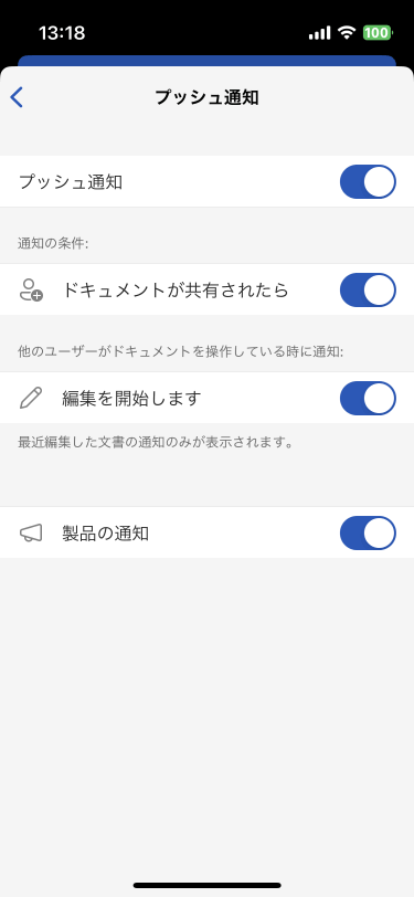 作業中の文書が共有されたとき、他のユーザーが編集を開始したときなどのプッシュ通知は既定ではオンになっています。 他の作業をしているときなどでその通知が煩わしいときは、通知をオフにできます。ホーム画面の[設定]から[プッシュ通知]をタップして、オフにしたい通知のスイッチをオフにします。iPhoneの[設定]➡[Word]からでも[Wordの通知設定]のリンクでたどることも可能です。