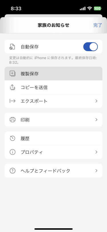 [ファイル]をタップしてをタップして[複製保存]をタップし、[複製]画面でファイル名と保存場所を指定します。ここでは、OneDriveの[公開]フォルダーに複製保存する方法について説明します。