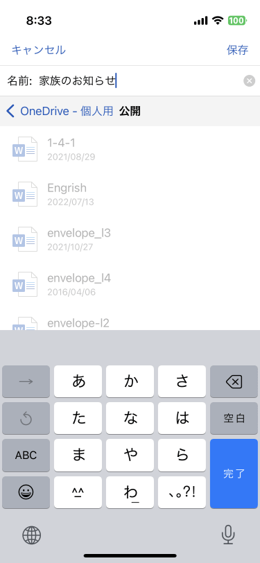 ファイル名と保存場所を指定します。ここでは、OneDriveの[公開]フォルダーを選択して[保存]ボタンをタップします。