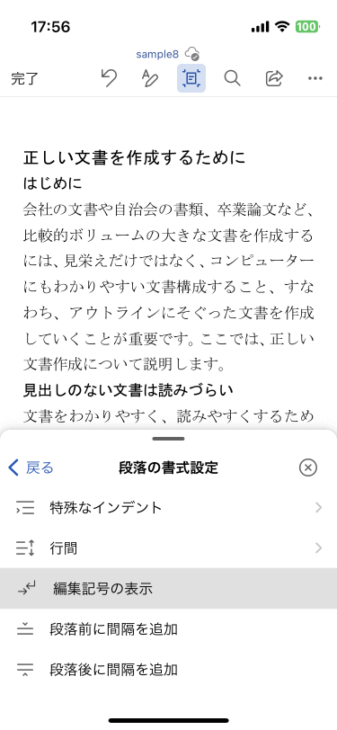 [編集モード]をタップしたうえで[ホーム]タブの[段落の書式設定]一覧から[編集記号の表示]を選択します。モバイルビューに切り替えておくとわかりやすいでしょう。