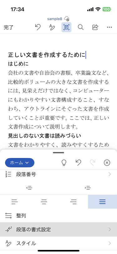 - [ホーム]タブの[段落の書式設定]をタップします。