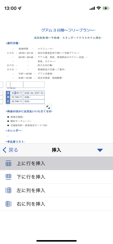 基準となるセル内にカーソルを移動して、[テーブル]タブの[挿入]一覧から挿入する場所を指定します。ソフトキーボード上部のツールバーの