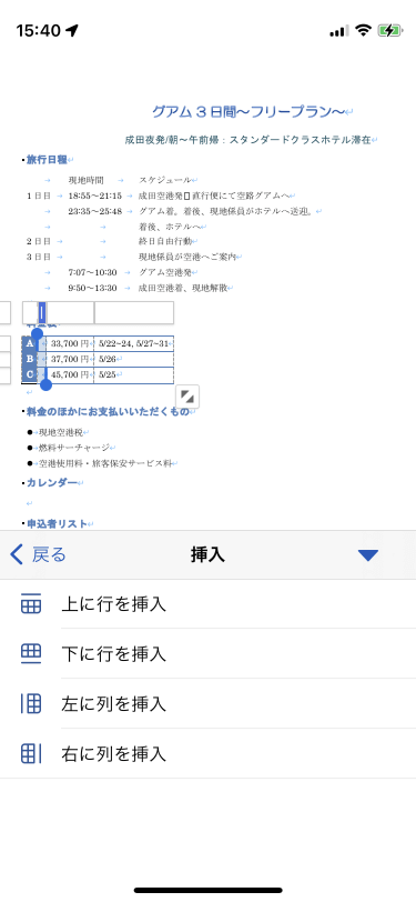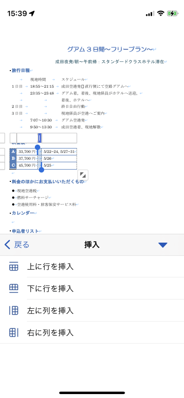 基準となるセル内にカーソルを移動して、[テーブル]タブの[挿入]一覧から挿入する場所を指定します。ソフトキーボード上部ツールバーの
