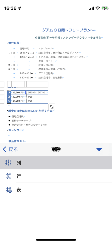 表内の対象となるセル内にカーソルを移動して、[テーブル]タブを開き、[削除]コマンド一覧より[列]を選択します。ソフトキーボード上部のツールバーの