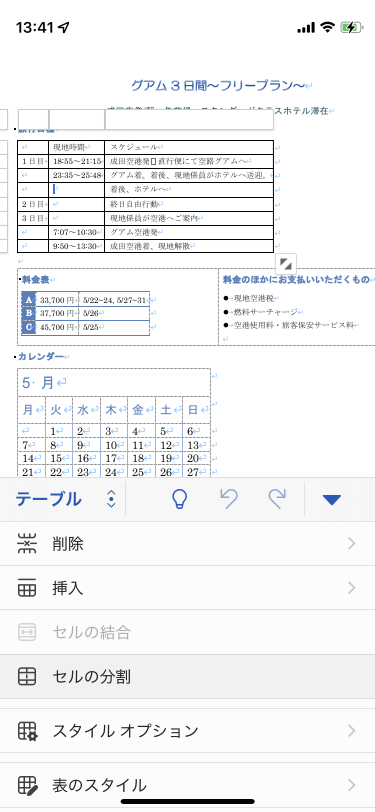 - [テーブル]タブの[セルの分割]ボタンをタップします。