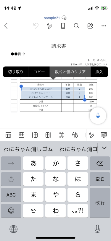 - 対象となるセルを選択し、ソフトキーボード上部の
