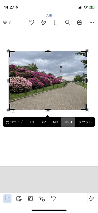 4:3や16:9、正方形など、一般的な縦横比に合わせてトリミングするには、対象となる図を選択して画面下部のツールバーから