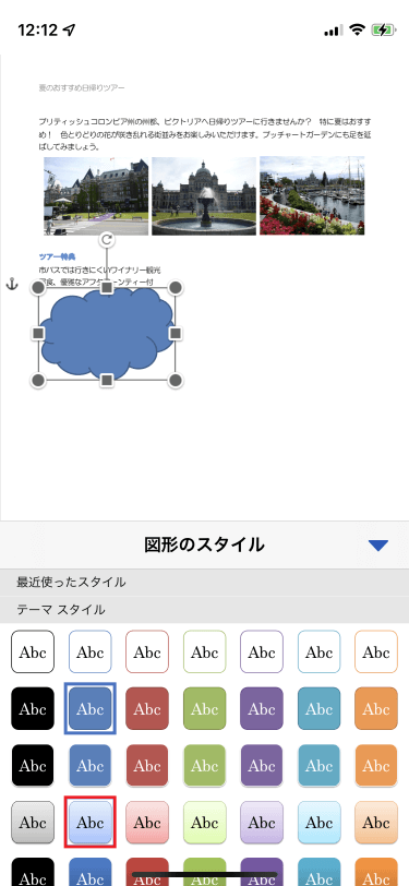 [図形のスタイル]をタップし、[図形のスタイル]コマンドから変更したいスタイルを選択します。