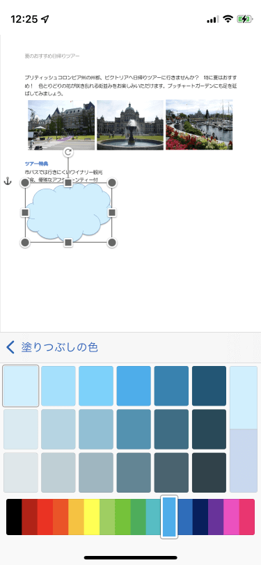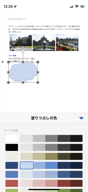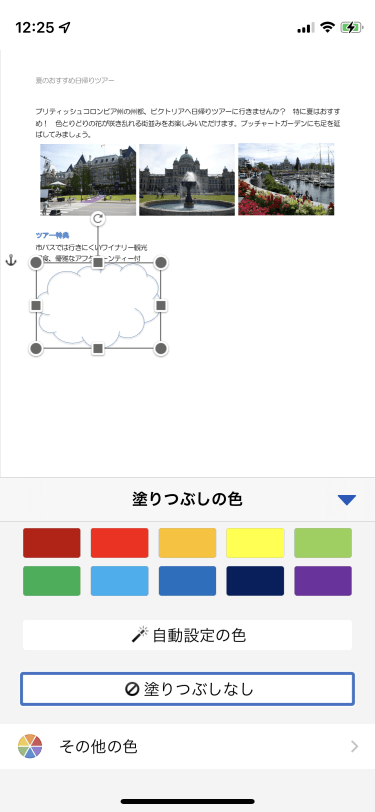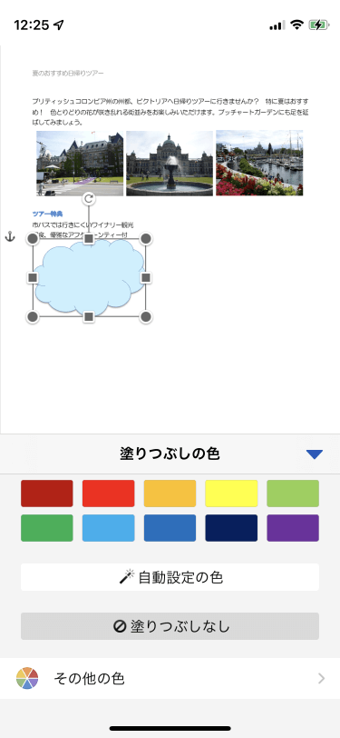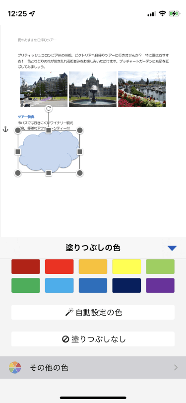[塗りつぶしの色]をタップし、[塗りつぶしの色]一覧から色を選択します。テーマにない色を指定するには、[その他の色]から色と色調を選択します。[色なし]にすると、塗りつぶしなしになります。