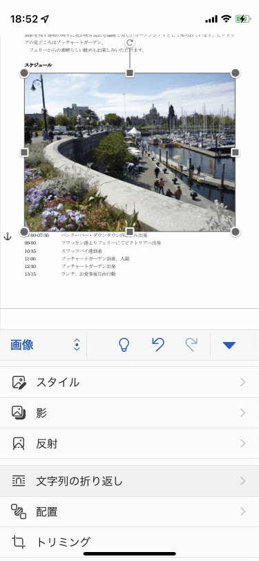 - [画像]タブ内から[文字列の折り返し]をタップします。