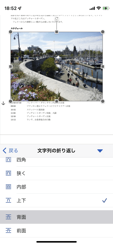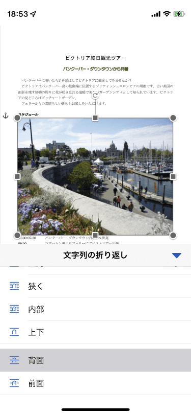 [リボンを開く]をタップして[画像]タブを開き、[文字列の折り返し]をタップして一覧から[背面]を選択します。画面下部の