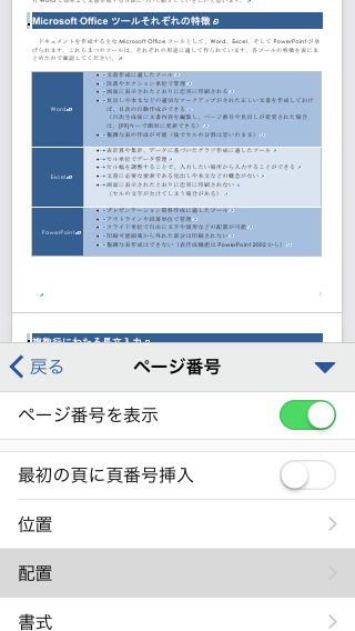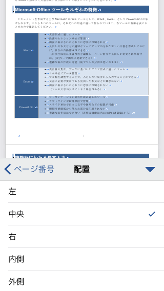 既定では右側にページ番号が挿入されます。中央にしたい場合は、iPhoneやiPod touch画面右上の