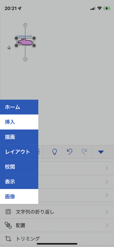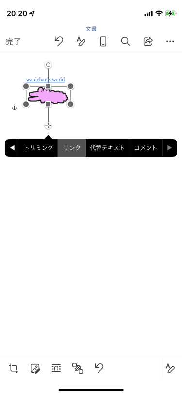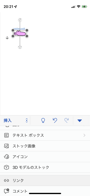 ハイパーリンクを挿入したい画像を選択し、ポップアップメニューから▶をタップして[リンク]を選択すると、ハイパーリンクの挿入画面が表示されます。