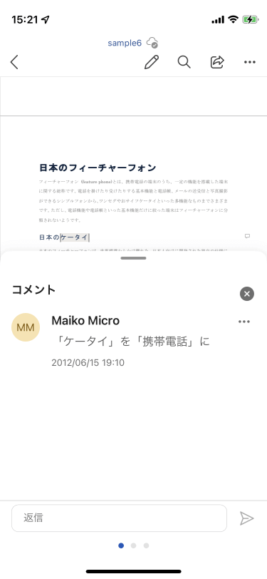 一つの自分の返信コメントを削除するには、そのコメントを長押しして[削除]を選択します。文書内のすべてのコメントを削除する場合は、画面右上またはツールバーの