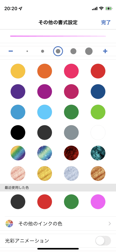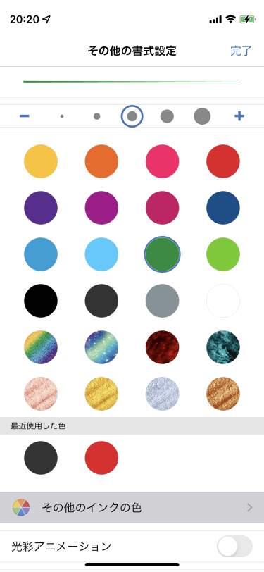 ペンの色を色パレット、インクの効果、フルカラーから自由に変更できます。描画ツールから変更したいペンを選択し、[その他の書式設定]一覧から変更したい色を選択します。なお、「光彩アニメーション」をオンにすると、描画中に光彩アニメーションが適用されます。