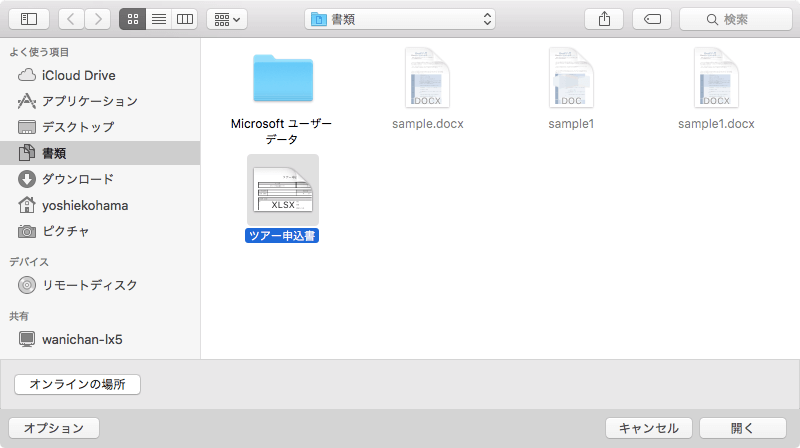 たとえば、[書類]フォルダーのExcelファイルを開くには、[ファイル]メニューの[開く]をクリック、もしくはクイックアクセスツールバーの[ファイル]をクリックして[開く]を選択して[自分のMac]を選択し、[書類]フォルダー内の開きたいファイルを選択して[開く]ボタンをクリックします。
