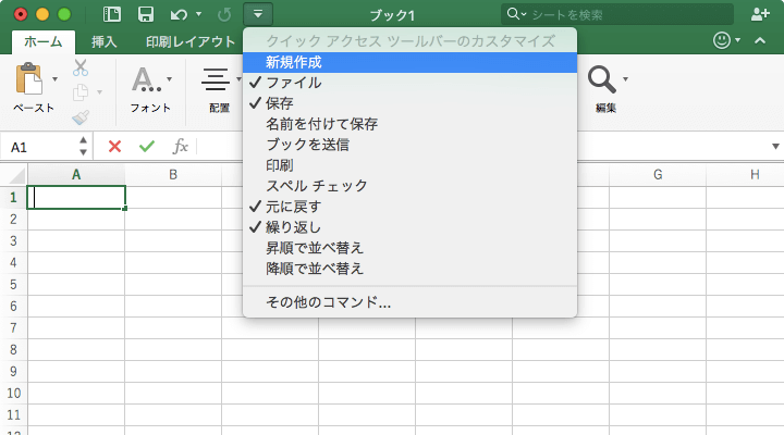 既定では[ファイル][保存][元に戻す][繰り返し][印刷]が表示されています。その他にも、「新規作成」「名前を付けて保存」「ブックを送信」「印刷」「スペルチェック」「昇順で並べ替え」「降順で並べ替え」のコマンドを追加することが可能です。[クイックアクセスツールバーのカスタマイズ]をクリックして、一覧から追加したいコマンドを選択します。