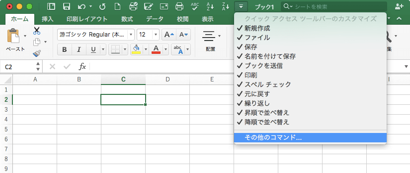 - クイックアクセスツールバーのカスタマイズメニューより[その他のコマンド]を選択します。