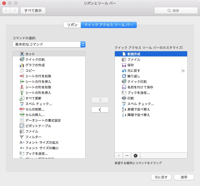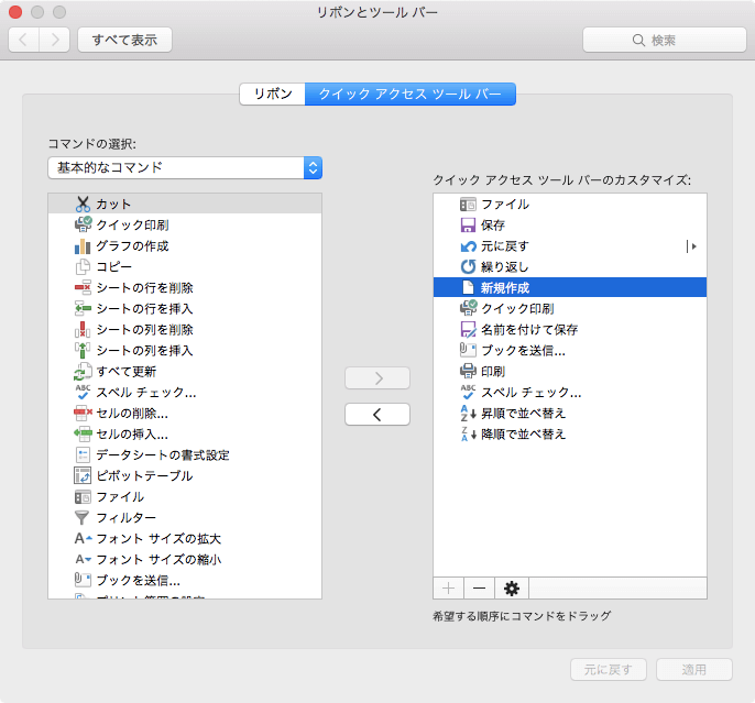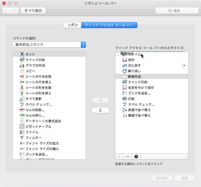 [リボンとツールバー]の[クイックアクセスツールバー]タブを開き、順序を変更したいコマンドを選択して移動先までドラッグしていきます。[適用]ボタンをクリックしてはじめて変更が反映されます。