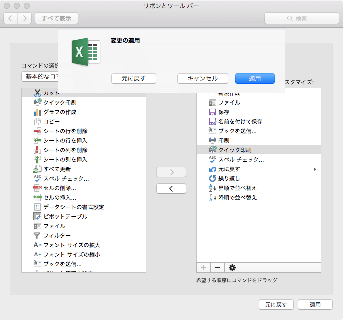 順序の変更が終わったら左上の赤いアイコンをクリックすると、以下の図のように表示されるので[適用]ボタンをクリックします。
