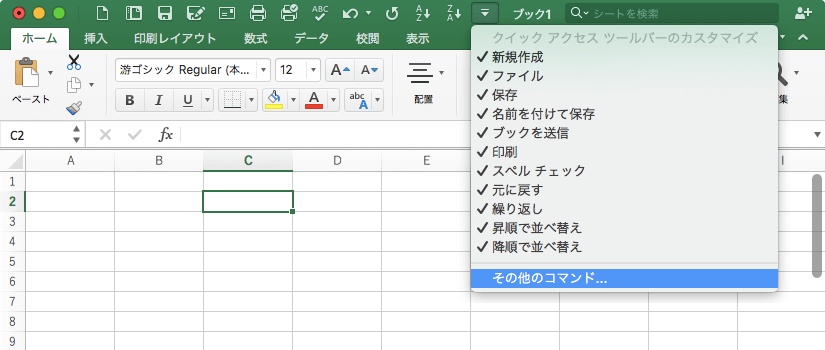 - クイックアクセスツールバーのカスタマイズメニューより[その他のコマンド]を選択します。