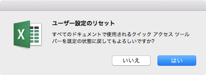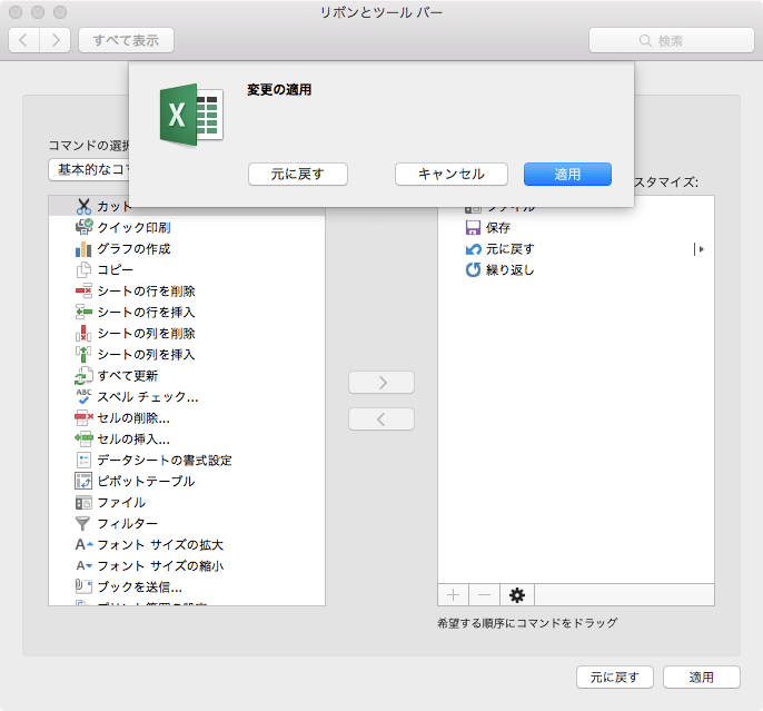 クイックアクセスツールバーがリセットされた後に左上の赤いアイコンをクリックすると、[変更の適用]のメッセージが表示されるので[適用]ボタンをクリックします。