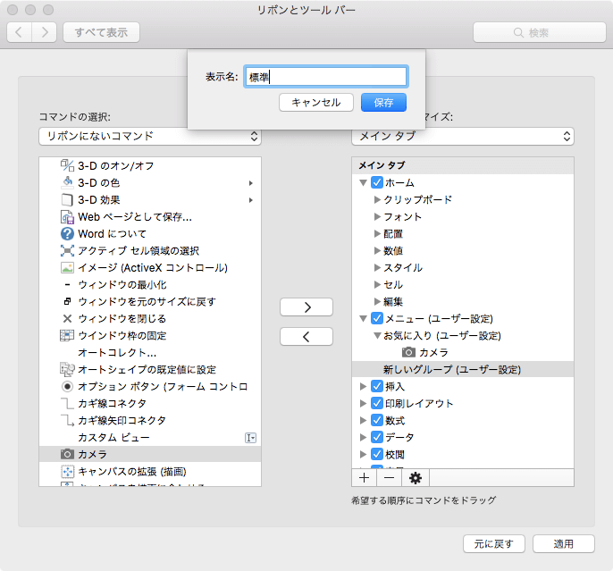 リボンのユーザー設定
