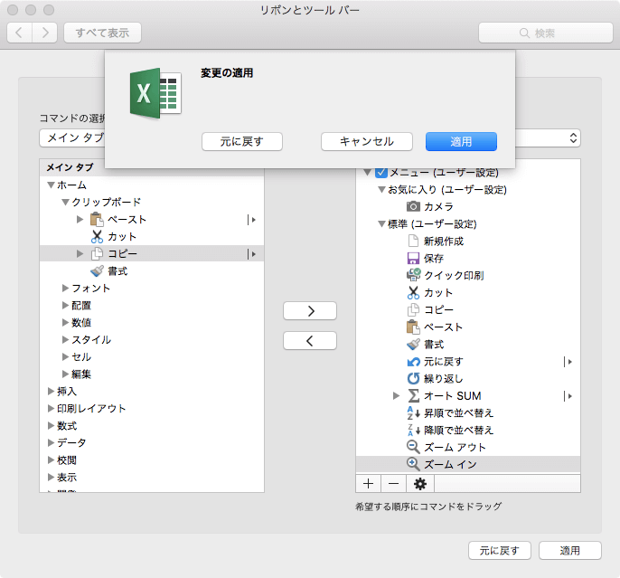 リボンのユーザー設定