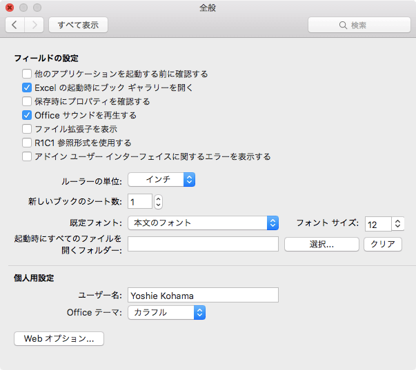 Microsoft Officeアプリケーションで特定の操作、たとえばファイルを開く、保存する、プリントするときや、エラーメッセージが表示されたときに、操作の結果を知らせる音を鳴らすには、[Excel]メニューの[環境設定]からExcelの環境設定の[全般]を開き、[Officeサウンドを再生する]のチェックを付けます。この設定を有効にすると、Excelに限らず、WordやPowerPoint等、Microsoft Officeアプリケーションすべてに適用されます。