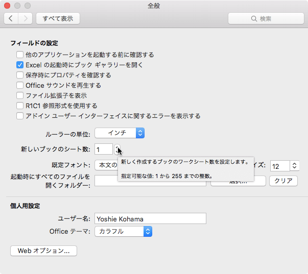 新しく作成するブックのワークシート数を設定するには、[Excel]メニューの[環境設定]からExcelの環境設定の[全般]を開き、[新しいブックのシート数]の数値を1~255までの整数で指定します。