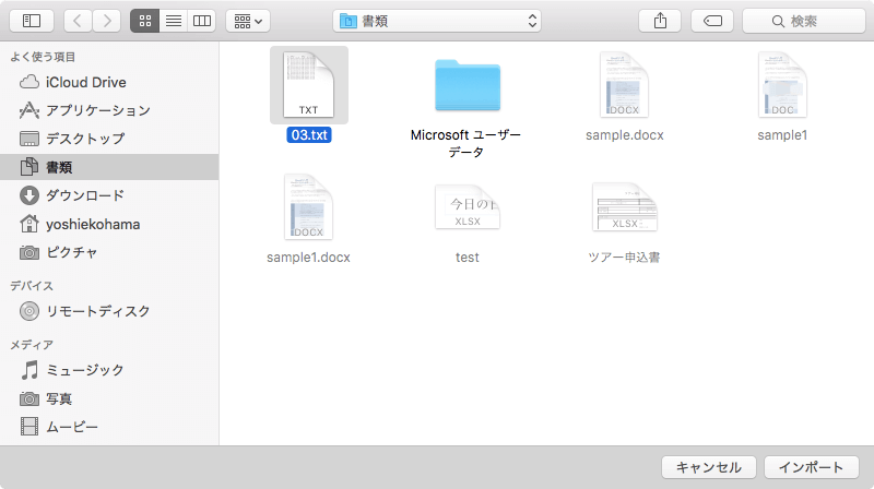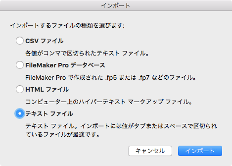- [インポート]ウィンドウから[テキストファイル]を選択して[インポート]ボタンをクリックします。