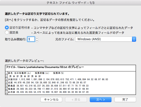 - テキストファイル形式を選択します。ここでは[カンマやタブなどの区切り文字によってフィールドごとに区切られたデータ]が選択されていることを確認します。