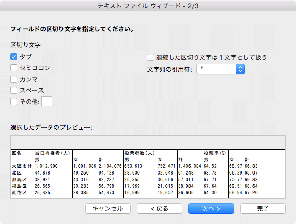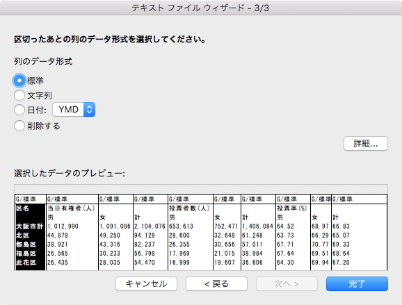 - 列のデータ形式をそれぞれ選択して[完了]ボタンをクリックします。