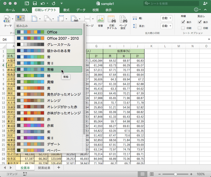 テーマはそのままで、配色は違うテーマのものにしたいという場合は、まず、気に入ったテーマを適用した後に[印刷レイアウト]タブの[テーマ]グループの[テーマの色]一覧より配色を変更します。配色を変更した後にテーマを適用すると違う結果になります。いろいろ組み合わせて自分の意図したイメージに仕上げてみましょう。