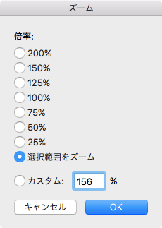 - [ズーム]ダイアログボックスにて[選択範囲をズーム]を選択して[OK]ボタンをクリックします。
