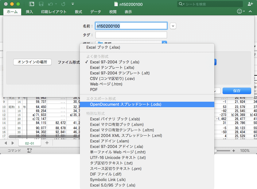 OpenDocumentスプレッドシート形式に保存するには