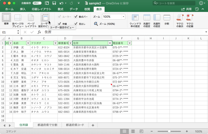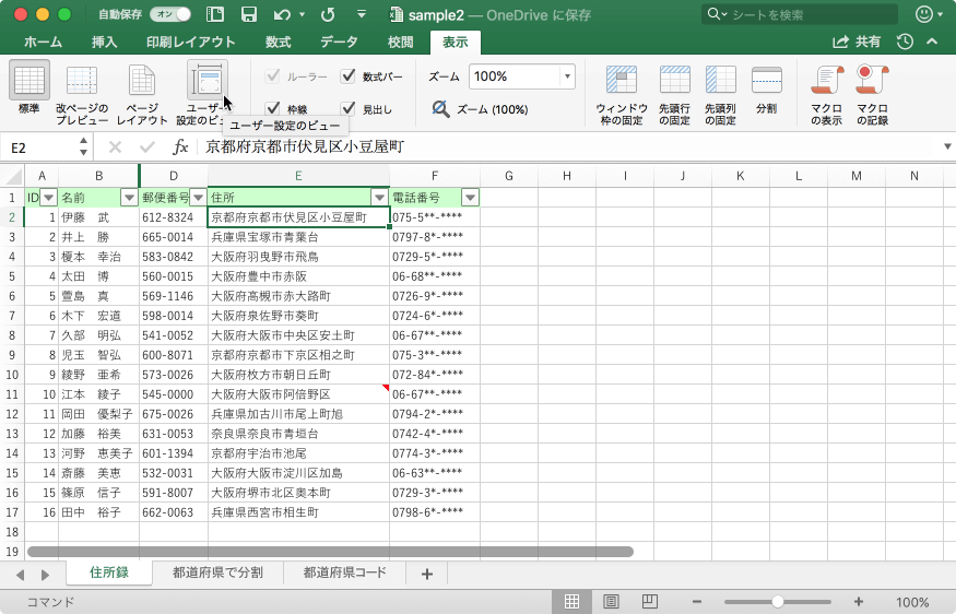 Excel 2016 for Macでワークシートの特定の表示設定(非表示の行と列、セルの選択、フィルターの設定、ウィンドウの設定など)と印刷設定(ページの設定、余白、ヘッダーとフッター、シートの設定など)を保存するには、[表示]タブの[ブックの表示]グループの[ユーザー設定のビュー]を選択します。ワークシートごとに複数のユーザー設定ビューを作成できますが、ユーザー設定ビューを適用できるのは、ユーザー設定ビューを作成したときにアクティブだったワークシートのみです。ユーザー設定ビューが不要になった場合は削除できます。