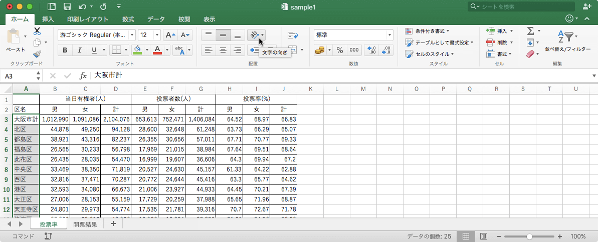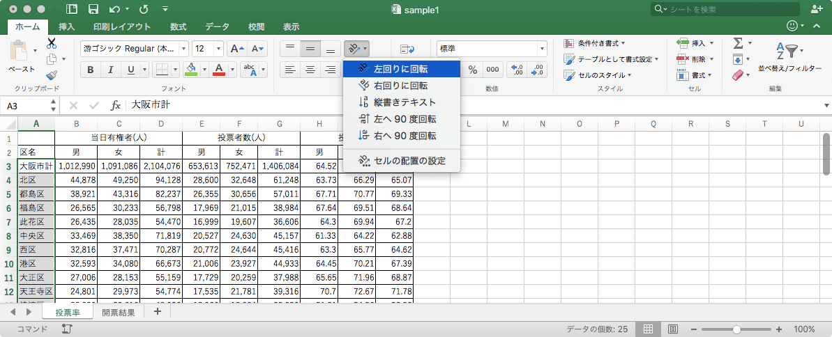 - 一覧から文字列の向きを選択します。