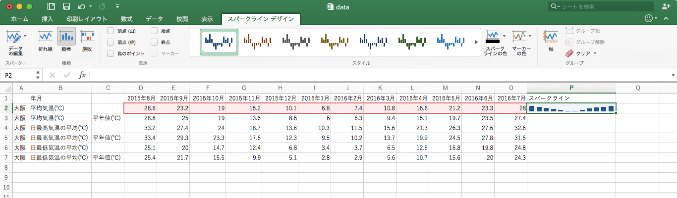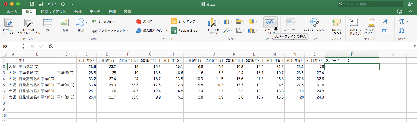 「スパークライン」とは、ワークシートのセル内でデータを視覚的に表現する小さなグラフです。Excel 2016 for Macで[挿入]タブの[スパークライン]グループから目的のスパークラインを選択します。