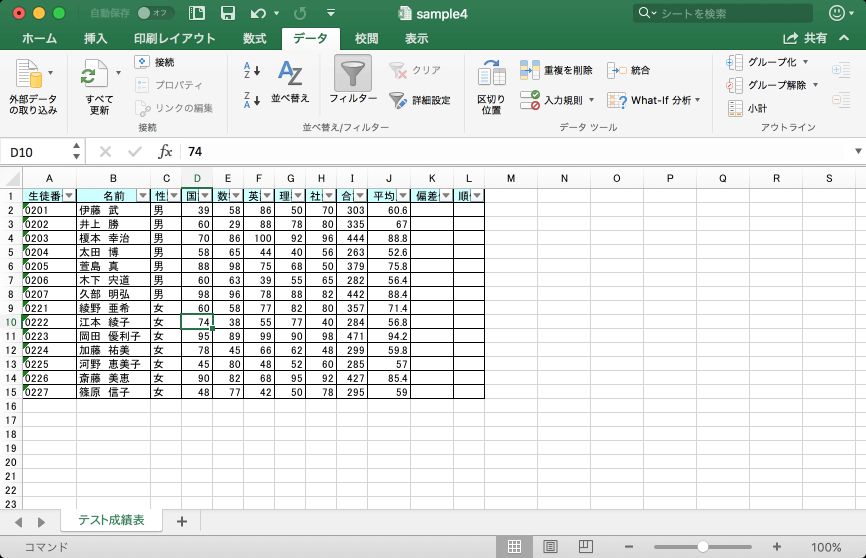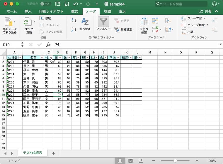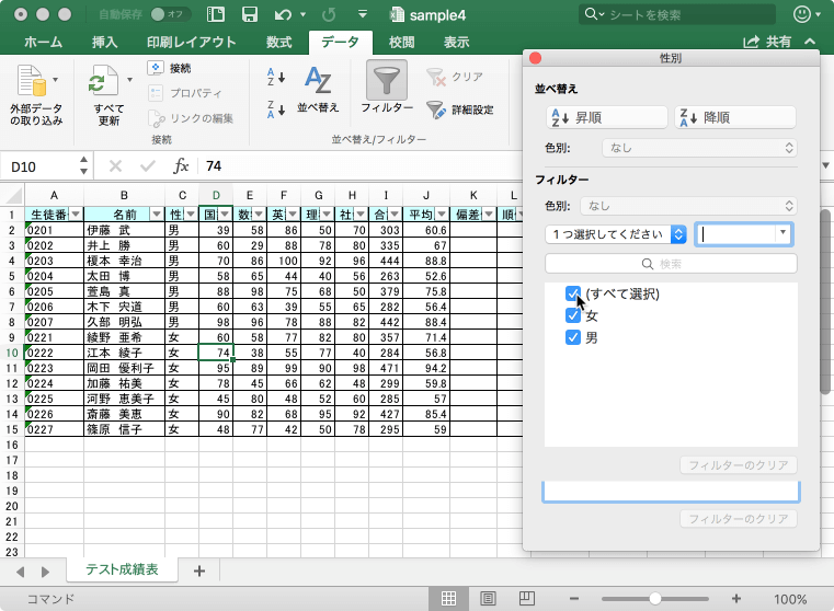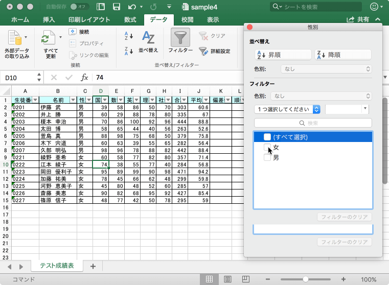 列見出しに▼ボタンを付けて検索できるようにするには、[データ]タブの[並べ替えとフィルター]グループの[フィルター]をクリックするか、[ホーム]タブの[編集]グループの[並べ替えとフィルター]一覧から[フィルター]をクリックします。Excel 2016 for Macでは[データ]メニューの[オートフィルター]を選択してもOKです。条件を設定したいフィールドボタンからフィルターを設定できます。
