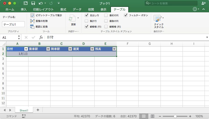 - [テーブル]タブが開かれ、テーブルに変換されました。
